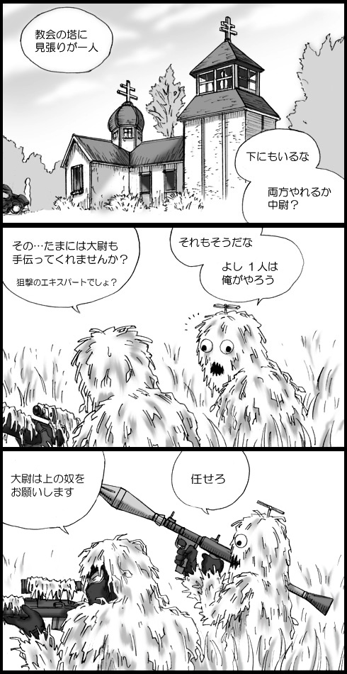 ちなみにこのネタ。最近「こんなスナイパーはいやだ」というスレを見つけたんだが、そのスレに昨年同じものが出ていた。やはりギリースーツ+RPGはギャップ萌えの定番ということだろうか。かくいう管理人も、オン対戦でスナイパーライフルを持っていく際にはRPGを携行していく。