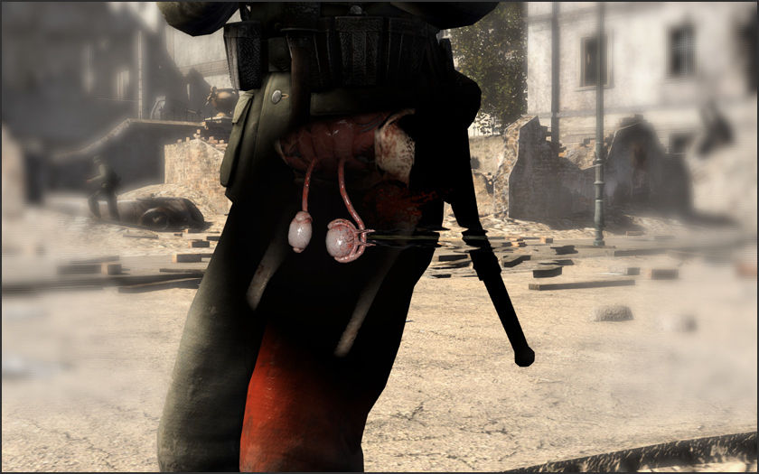 『Combat Arms』のナッツショットSniper Elite:V2のナッツショットがこれらと一線を画しているのは、本来目にすることのない「内臓器官としての睾丸」の破壊をまざまざと描いた点である。白っぽくつるりとした――毛むくじゃらの外観とはまるで違うナイーヴな器官が無残に粉砕される様は、多くの男性プレイヤーの睾丸を縮みあがらせた。