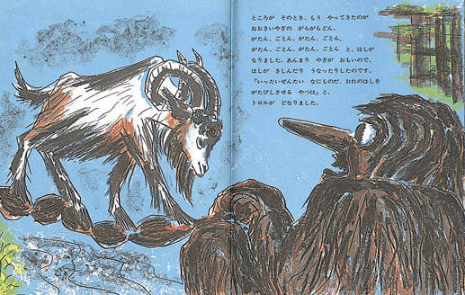 小さい山羊・中くらいの山羊・大きい山羊が順を追って登場する構成は読み聞かせにおける「繰り返しのリズムの面白さ」を狙ったものだと聞いたことがあるが、バイオレンスアクション的に見れば最終的な逆転のカタルシス(弱い山羊が巨大な怪物を圧倒する)を育む効果も生んでいる。