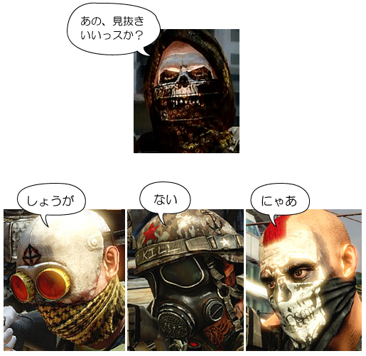ちなみに一番下の画像は“廃墟のドバイで大暴れ”というコンセプトで話題になった『Spec Ops:The Line』より。マルチプレイ用のDLC「フーバーパック」で使用できるキャラらしい。個人的に大好きですこういうデザイン。キャンペーンの渋いイメージとはかなりズレがあるけどね。そもそも対戦に人がいねぇ。