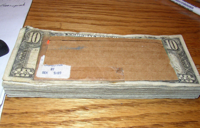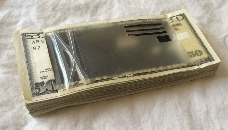 FBIのサイトにパックの画像があったが、札束の中をくり抜いて入れてある。おそらく中央が染料ケース、左右の箱は通信機と発火装置だろう。