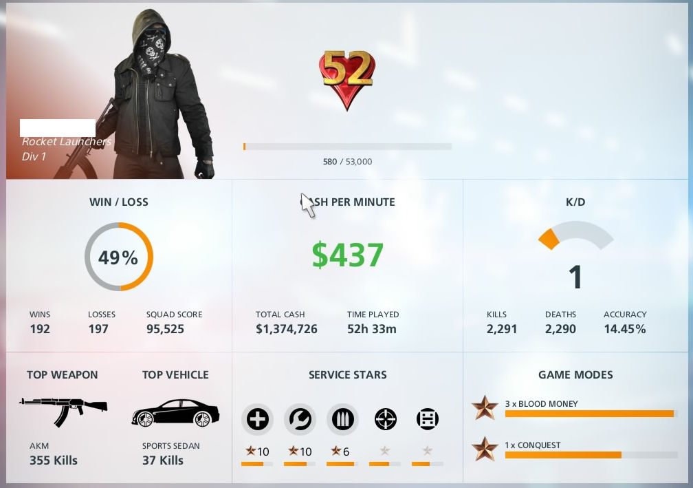 これはBattlefield:Hardlineのバトルログ(戦績)で、対戦における総プレイ時間やこれまでの勝敗、使用頻度が高い武器等を見ることができる。