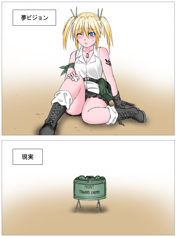 プレイヤーの後ろを味方兵士(NPC)がついてくるようになり、ランダムで目隠しをしてくる。ブチ切れること間違いなしの致命的ハンデだが、そのNPCが美少女兵士だったら怒りも紛れるだろう。もしかすると、戦闘の及ばない場所で「だ〜れだ♥」「おいおいやめろよ〜♥」みたいなプレイに没頭し、戦線離脱する効果も望めるかもしれない。
