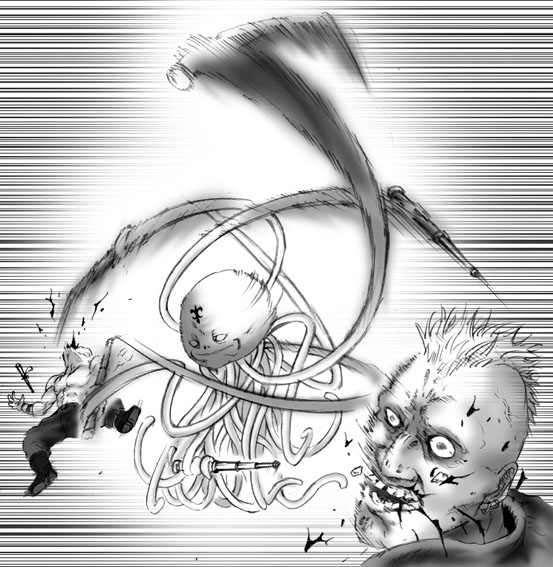 現在当サイトのマスコットに任命しているコイツに相方が欲しいな、と思いたち、ずいぶん前に考案した怪物だ。うねうねした触手がチャームポイントだが、何本あるのかは管理人にも分からない。